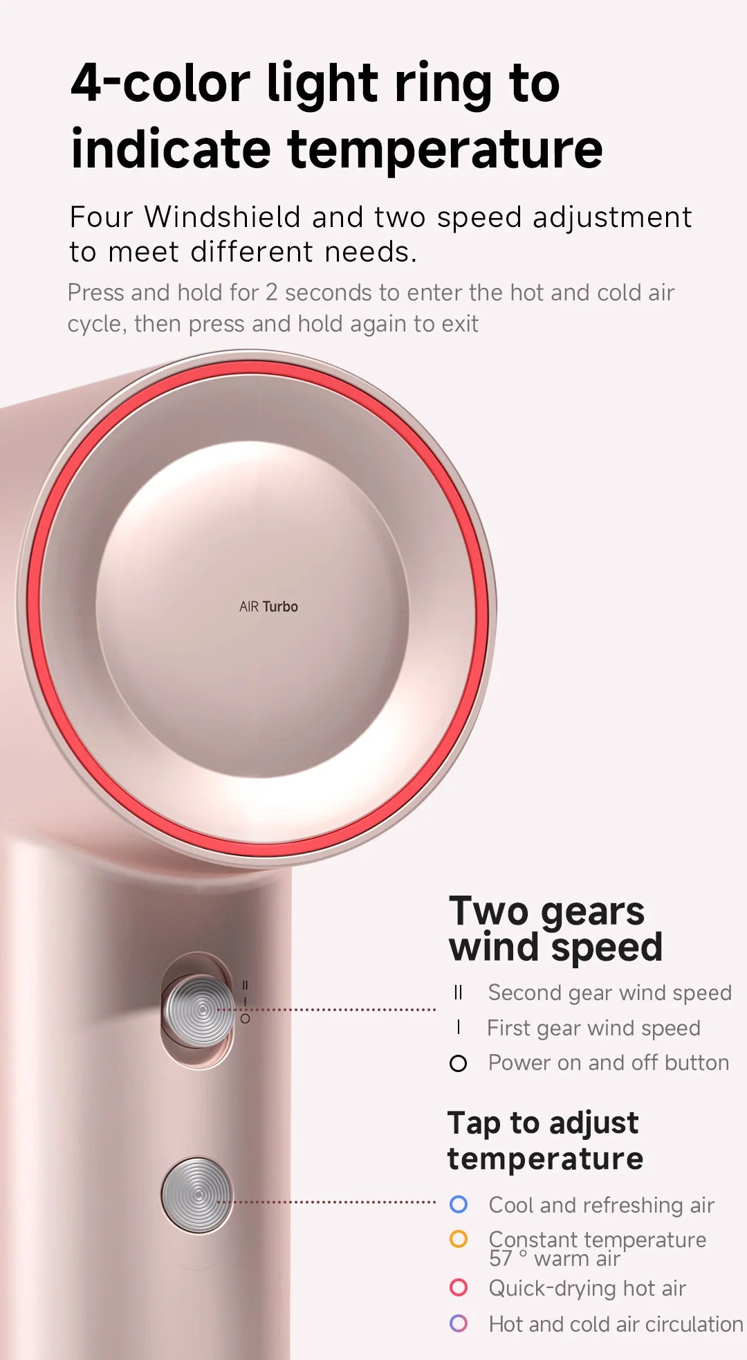 This product has 4 temperature settings available, and each time the temperature range is pressed, the temperature will switch. These four temperatures are [cold hot air circulation], [hair care], [hot air], and [cold air]. Every time the temperature is switched, the ambient light above the handle will display different states.