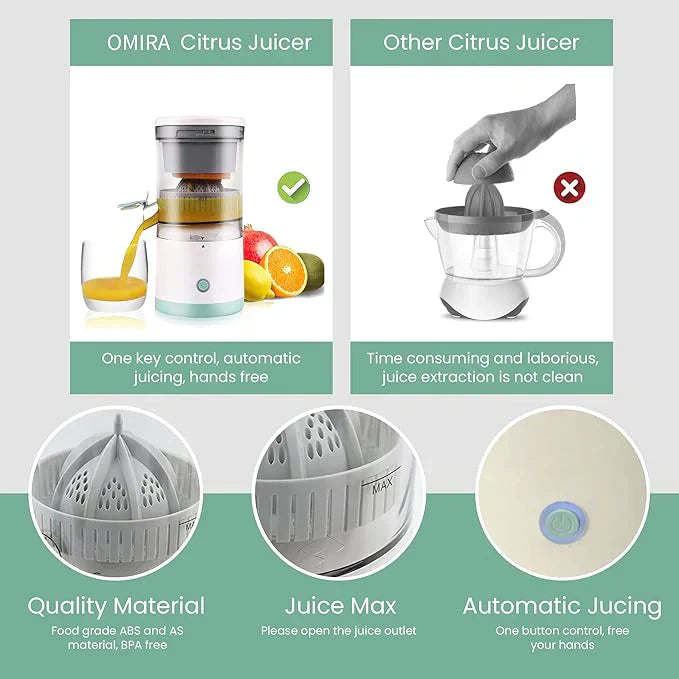 • 🍐 PORTABLE MIGHTY JUICER, GETS EVERY LAST DROP, EVERY TIME: The OMIRA Juice Vortex is the Ultimate Portable Juicer that can be carried anywhere in your bag for any outdoor adventure! This USB-C Rechargeable Electric Citrus Juicer is powerful enough to last numerous juicing sessions. The one-size fits all design works with oranges, apples, pears, grapes, lemons, watermelon, and even pomegranates.
