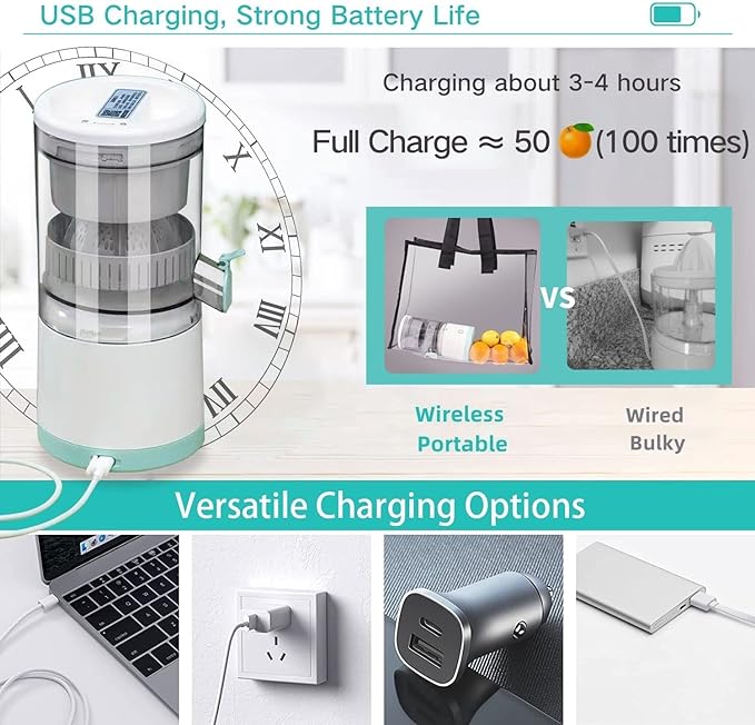 • 🍊 High Efficiency Juicing 🔄: Experience 360-degree omnidirectional three-dimensional juice extraction with superior efficiency and effective separation of pulp. This juicer meets all your juicing needs. It's USB rechargeable, cordless, and portable, allowing you to enjoy fresh juices anytime, anywhere, with confidence. 🥤🔋